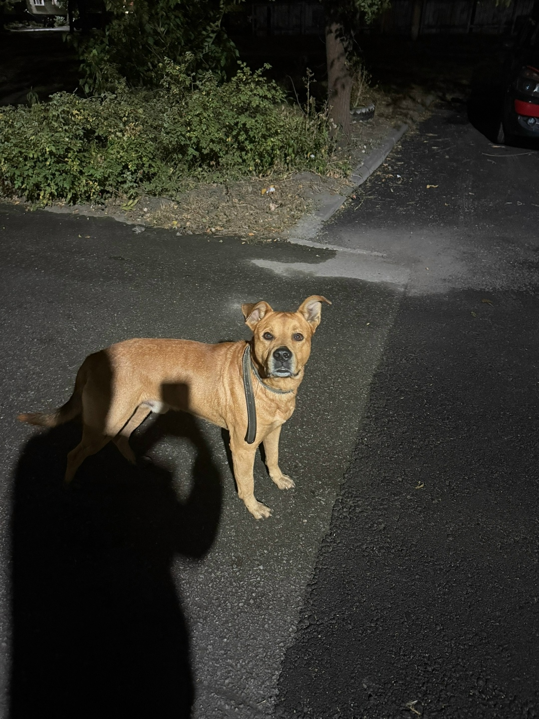 Рыжий кабель, добрый, к людям подбегает принюхивается. Явно ищет хозяина. Похож на стаффорда.