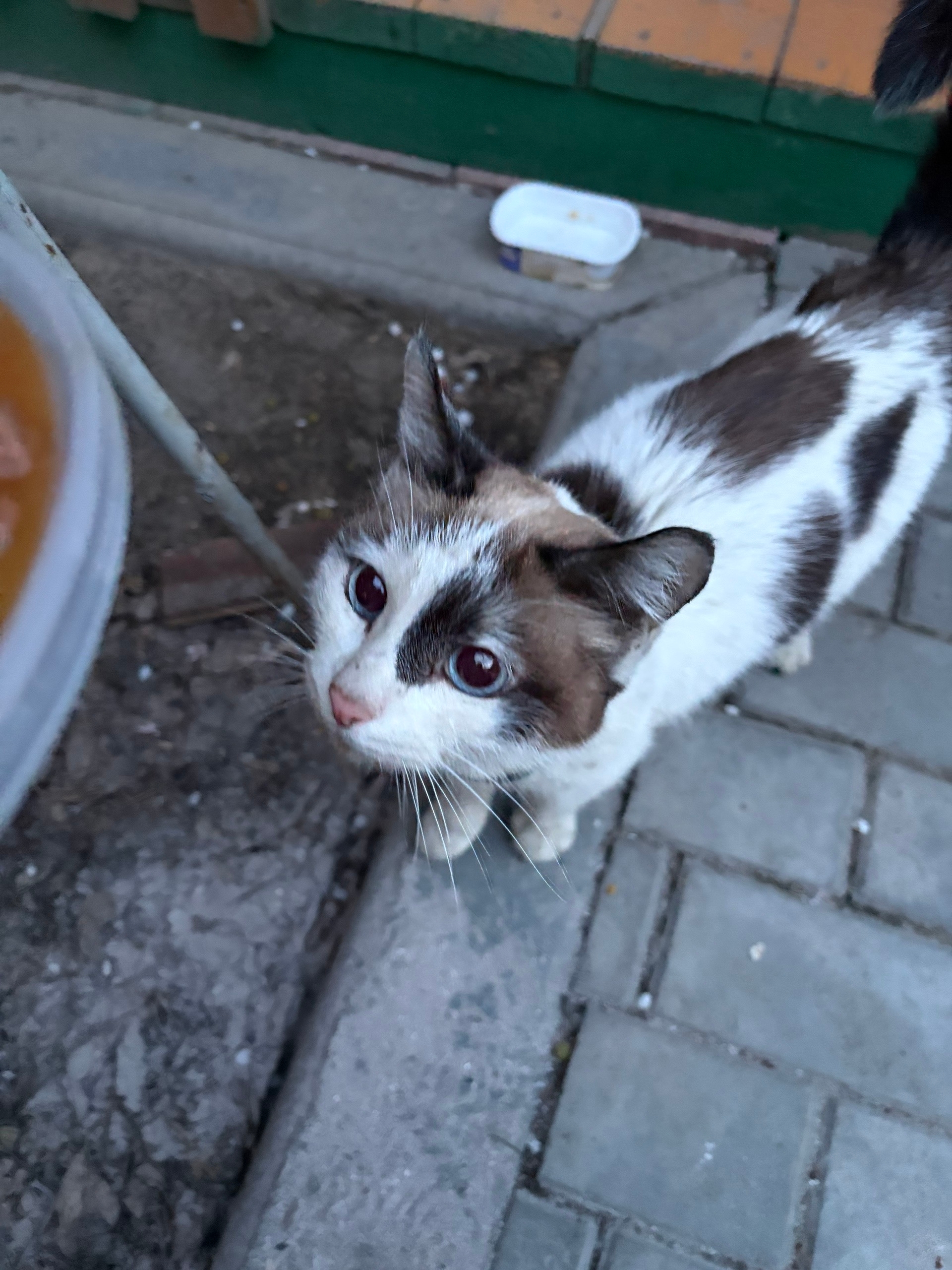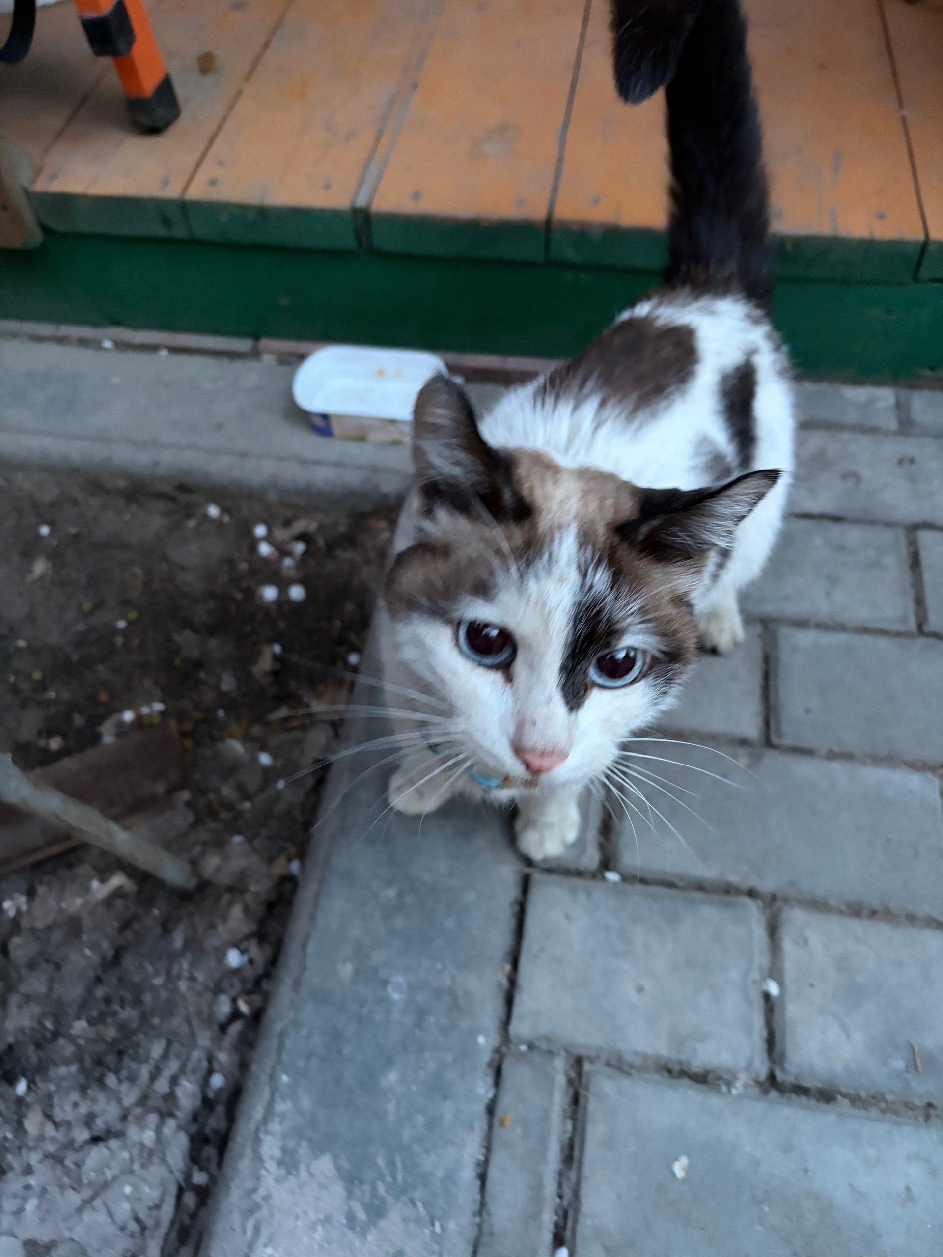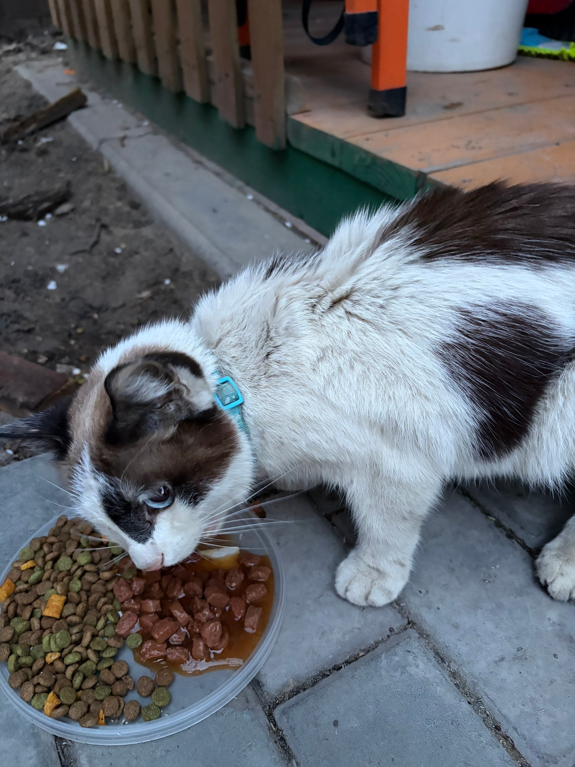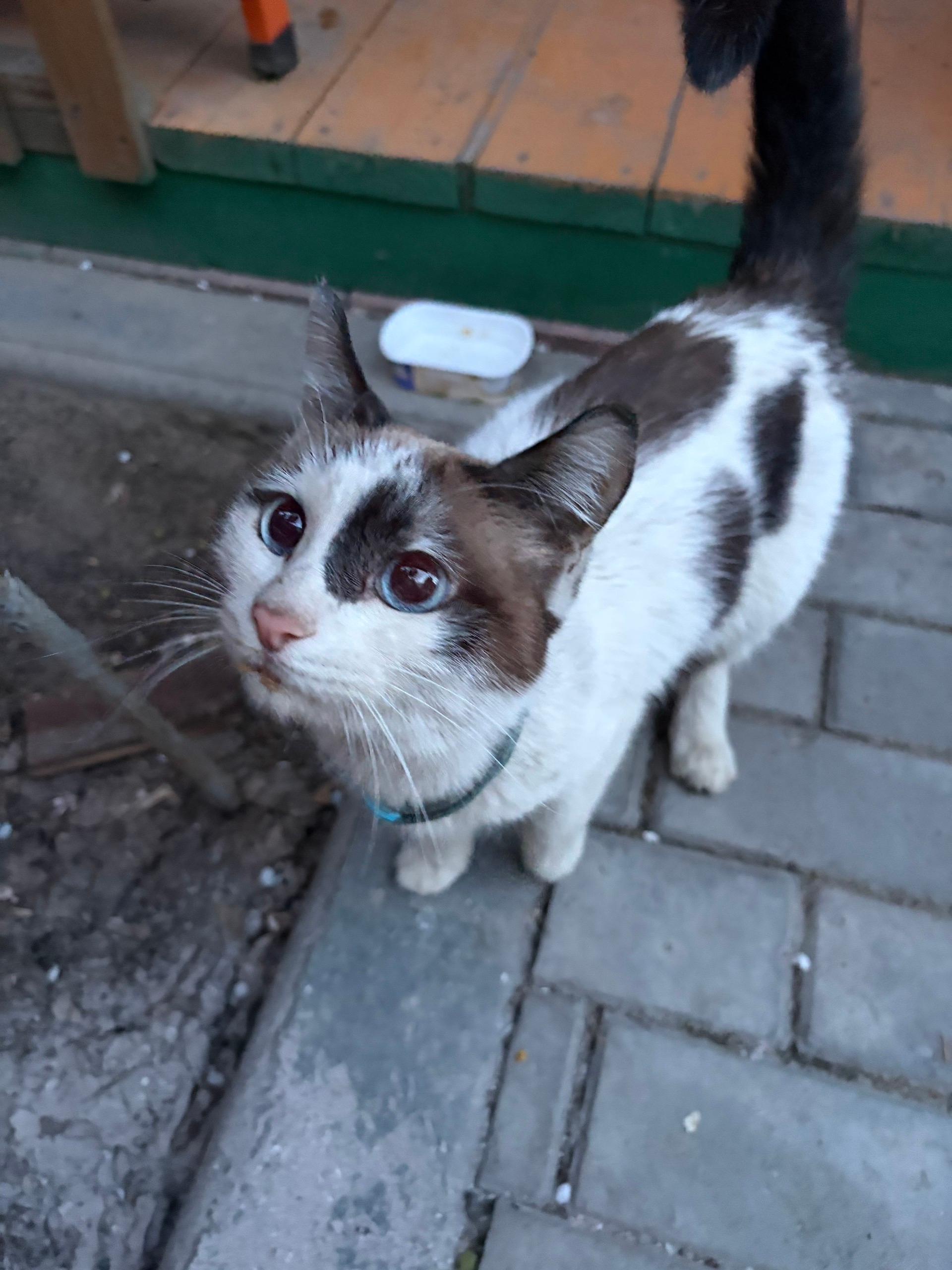 Найдена кошечка в переулке Волкова. Очень ласковая. С космическими голубыми глазами. Истощена. На шее голубой ошейник с орнаментом из белых следов лап.