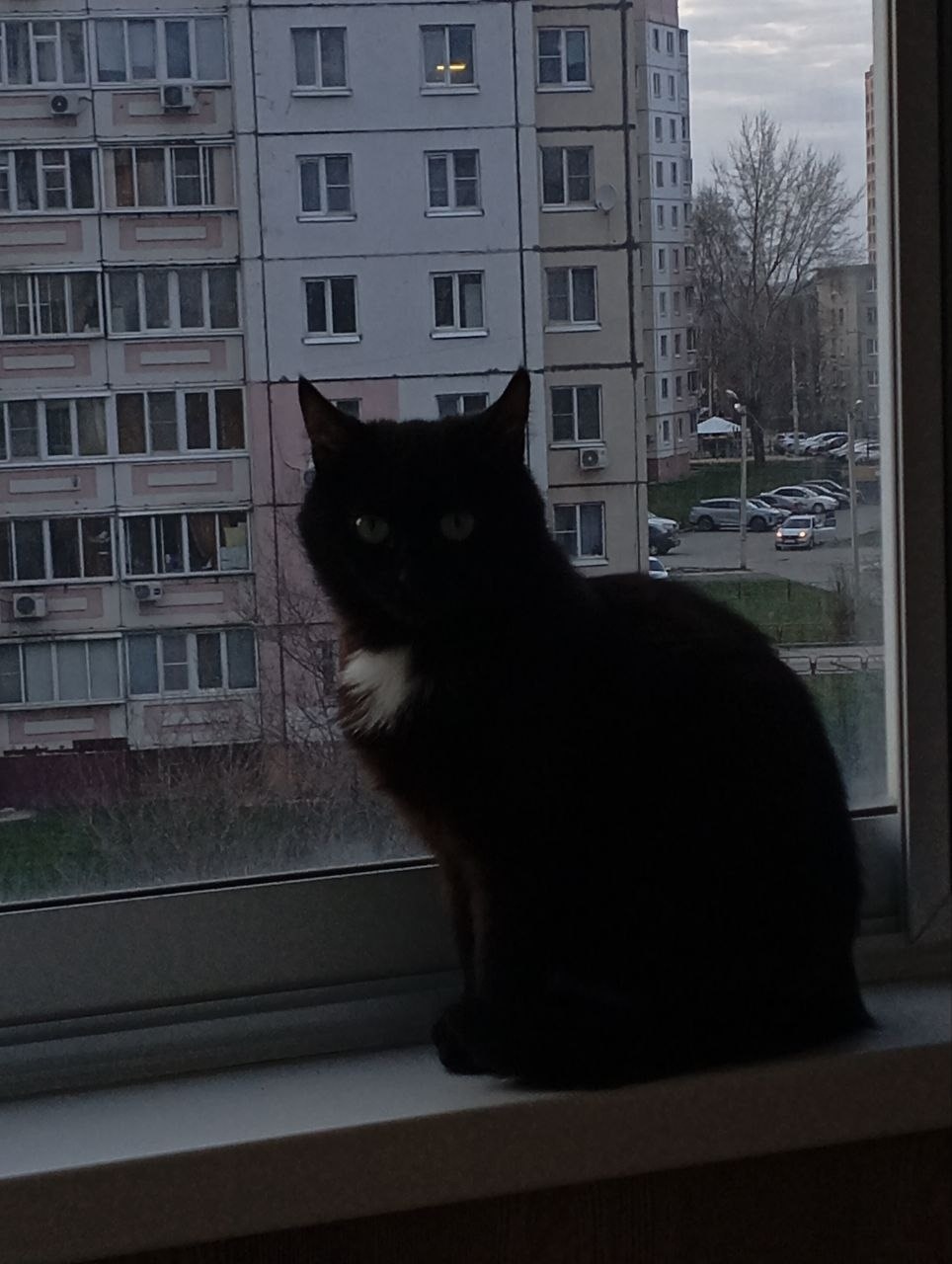 Сама кошечка черная с белым пятнышком под шеей, жёлтые глазки.