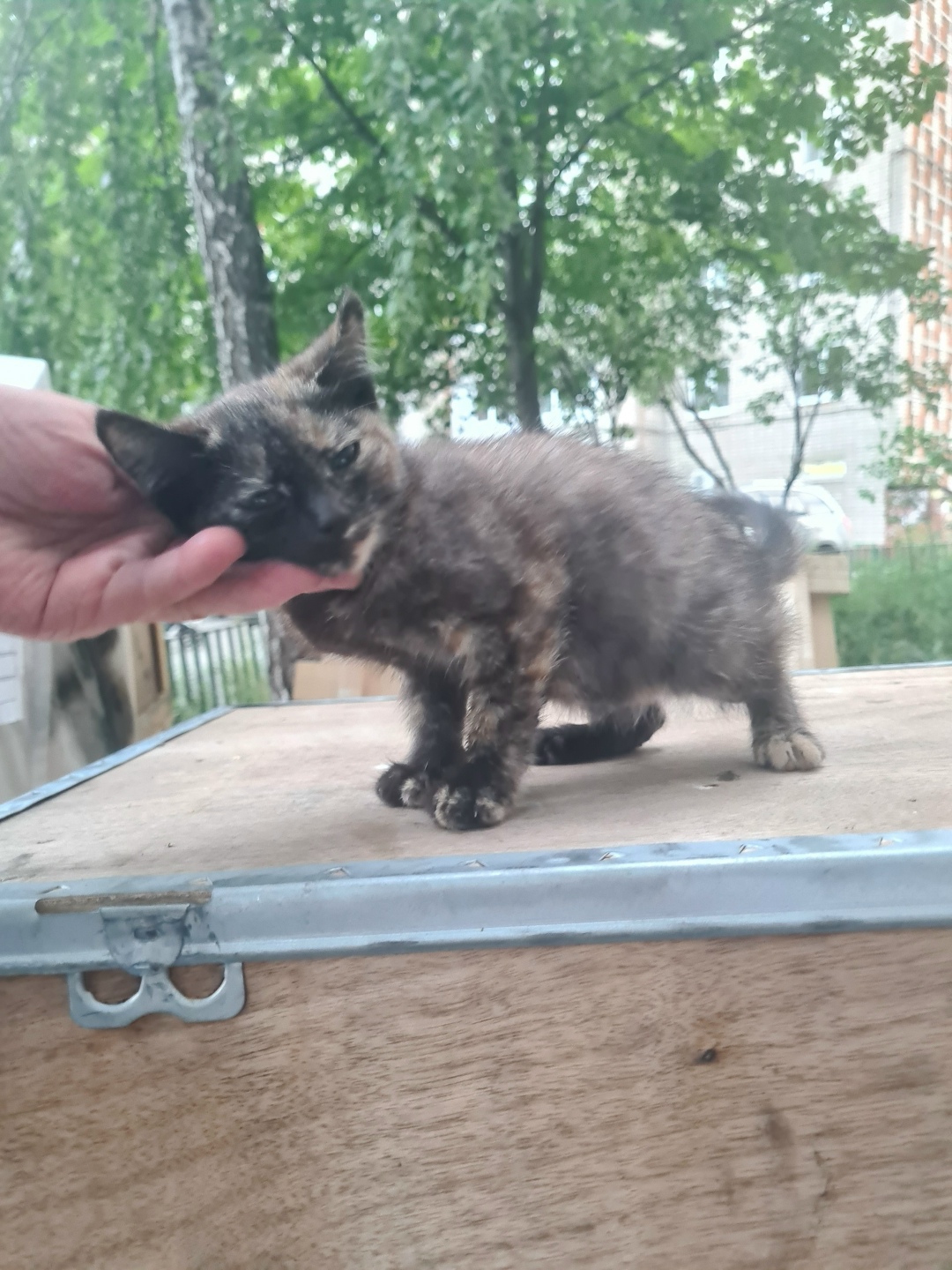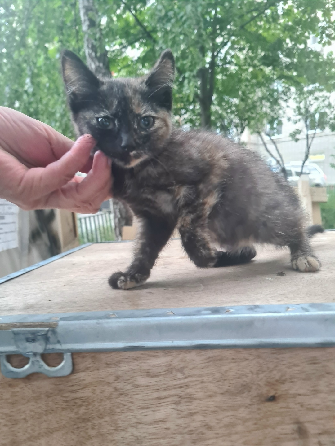 Это девочка черепахового окраса, ей примерно 1,5-2 месяца, очень маленькая, безумно красивая и ласковая.