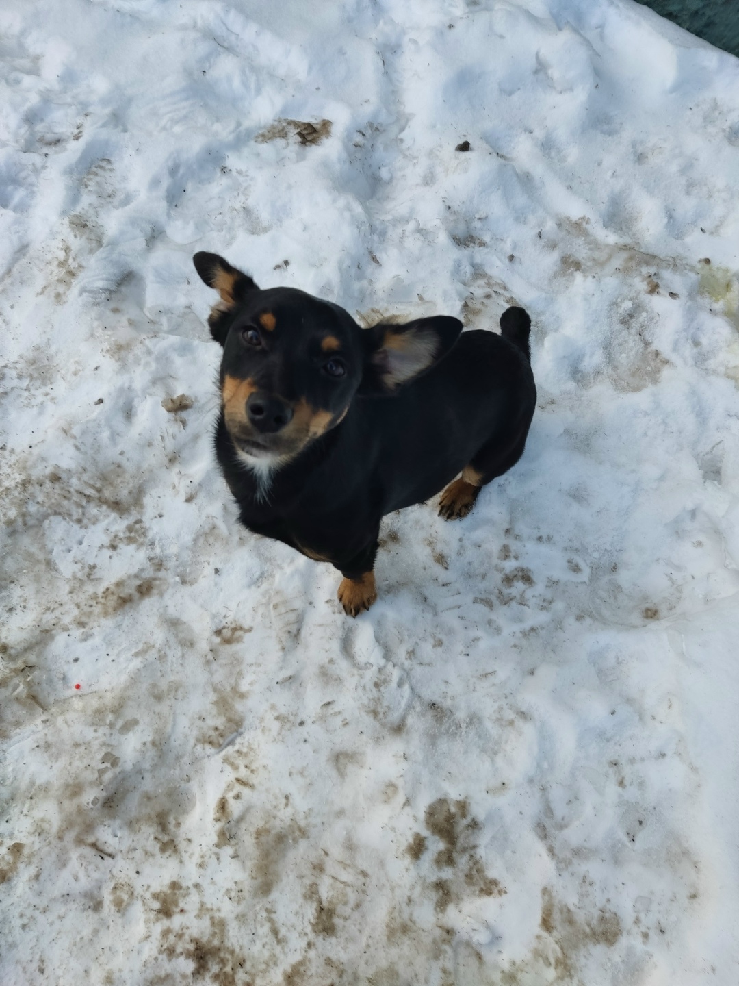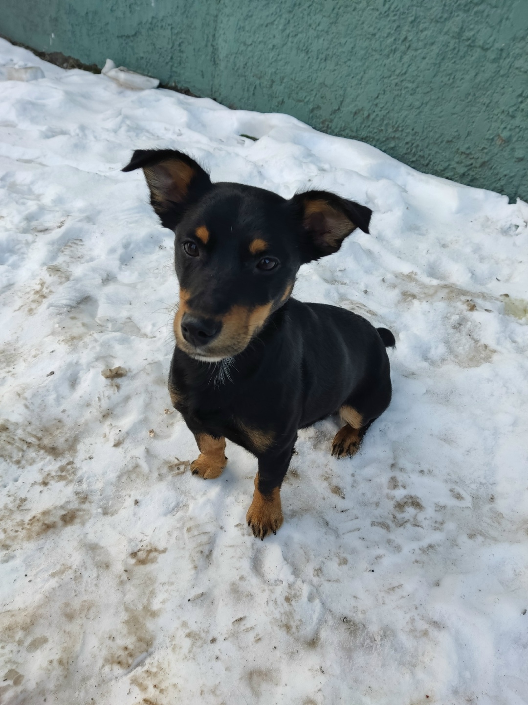 Найдена собака в районе магазина «Пятёрочка» (напротив катка). Предположительно ягдтерьер, молодой кобель. Хвост купирован. Пёс очень сильно замёрз, плачет.