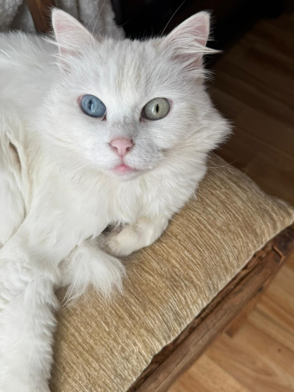 Комочек нежности и доброты. Очень милая, добрая, спокойная девочка. Просто выброшенная на улицу хозяином алкашом( поэтому мужчин побаивается) Её забирали и выкинули обратно. Потом её закрыли в подвале. В общем много чего эта кошка пережила. Она глухая. В лоточек ходит без проблем. Ест сухой корм, обожает пакетики) любит покушаться,толстенькая.