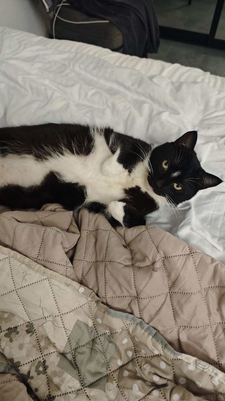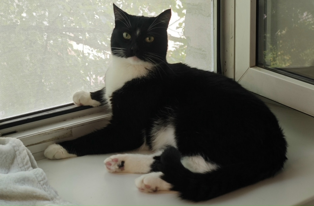 Потерялся черно-белый кот. Кличка Пряник. На лбу белый ромбик, белая грудь, на лапках белые перчаточки.