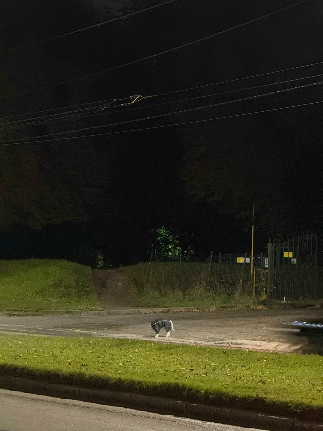 Собака (бультерьер) в комбинезоне. Хозяев рядом не видели, кажется, что потерялась. Ходит у дороги из стороны в сторону с поджатым хвостом