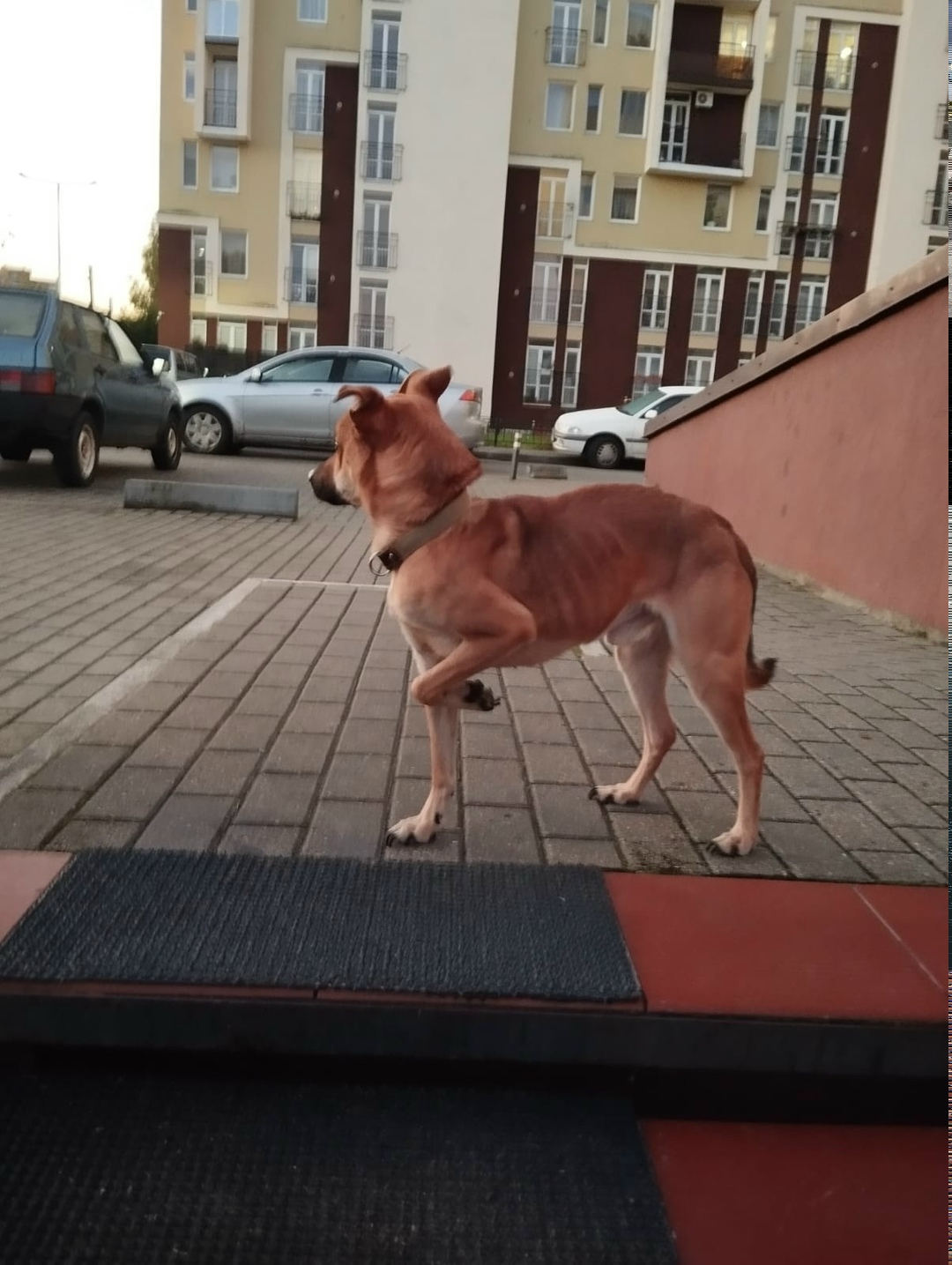 Во двор ул. Горького, 176 Г, корпус 2 пришёл пёс с ошейником. Ночевал в подъезде, очень волнуется. Хозяин отзовись!
