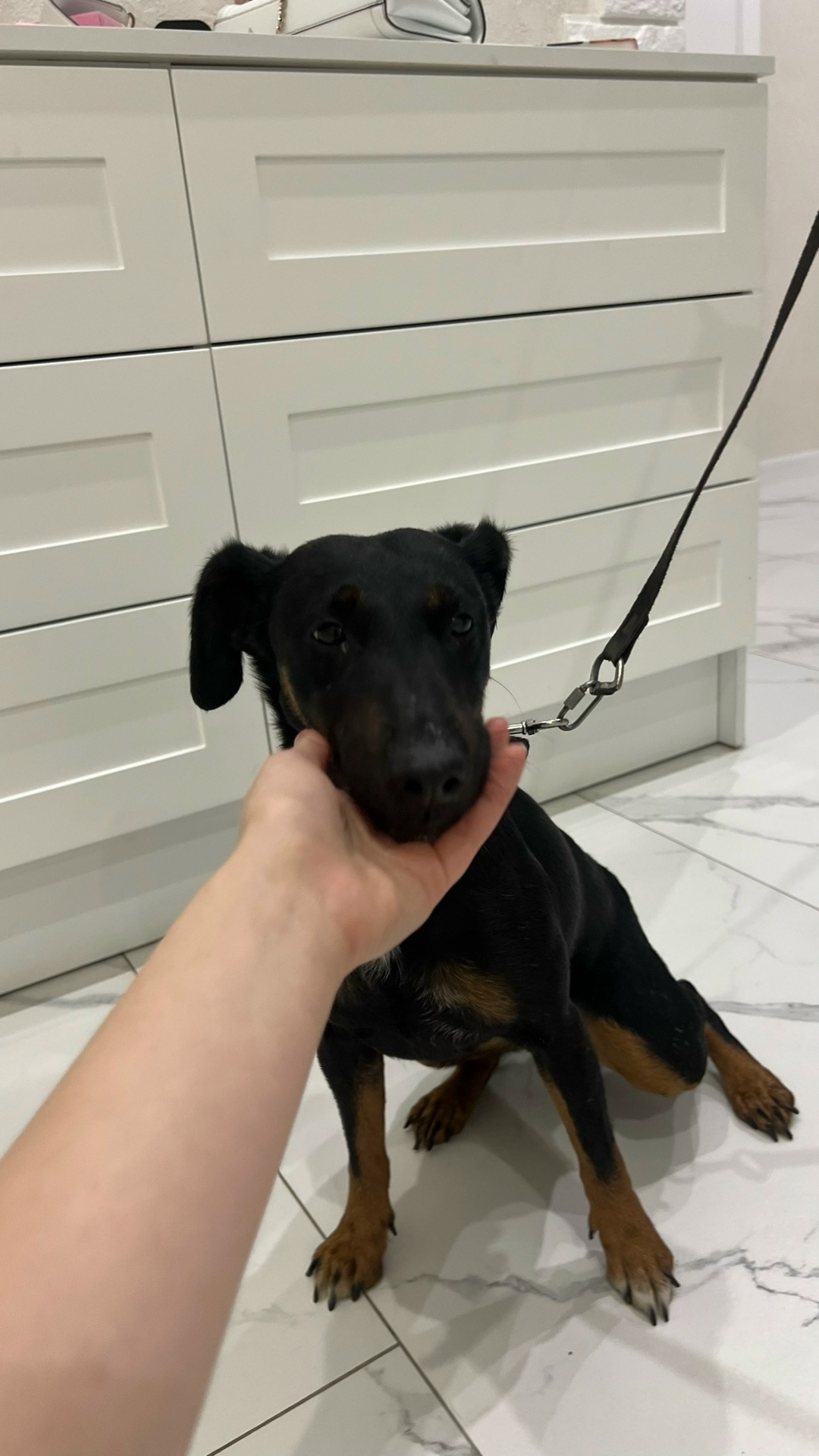 Окрас Чёрно-бежевый с белым пятнышком на груди.
