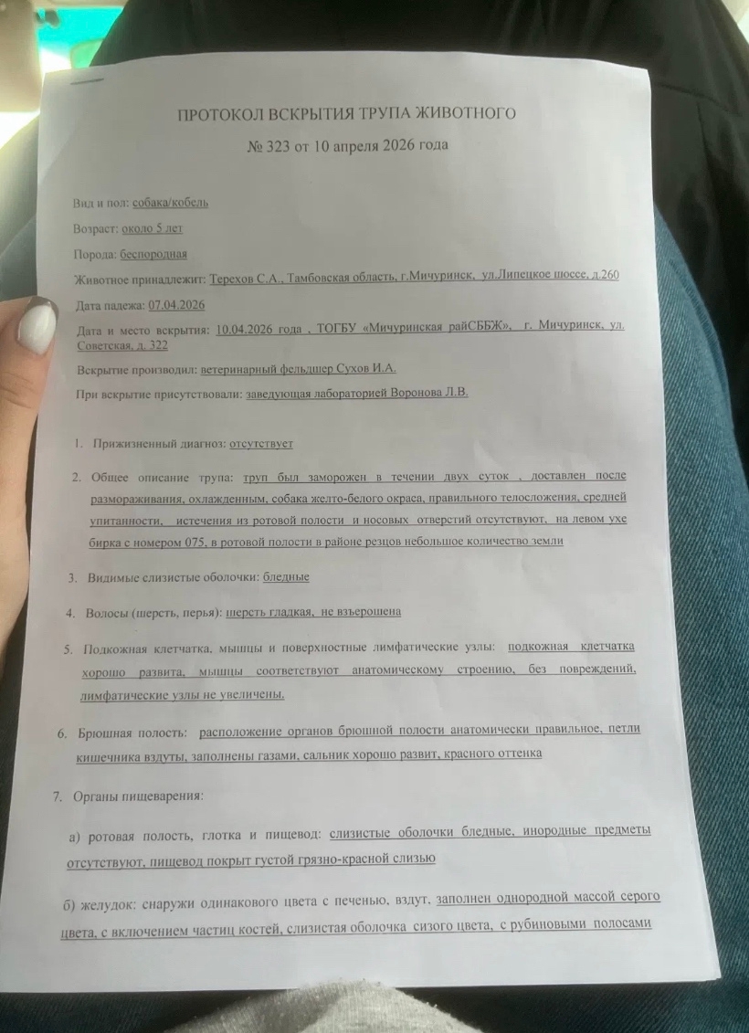Как стало известно из открытого источника сети интернет 07 апреля 2026 года в Мичуринск, Тамбовской области, в районе улицы Липецкое шоссе, ориентир дом 260, был найден труп любимца улицы пса Полкана. Протокол вскрытия показал, что пёс погиб в результате воздействия отправляющих веществ. Отравили и даже не простились как следует, а просто выбросили как никчемный мусор.