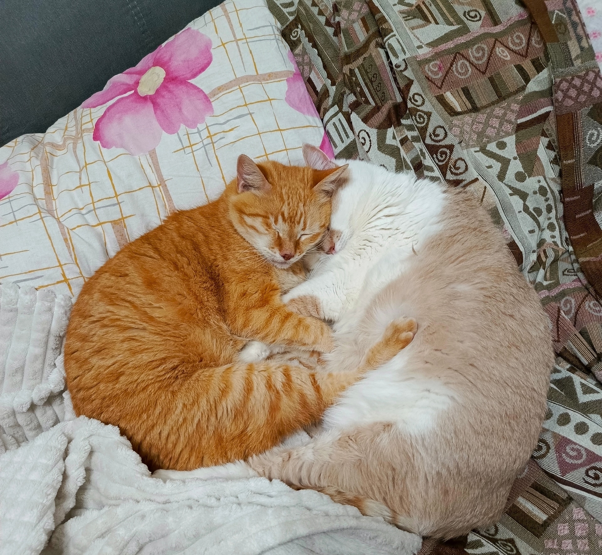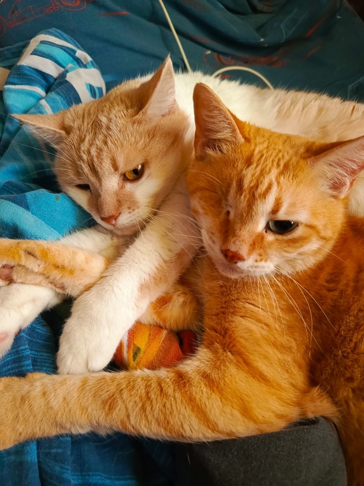Шансов у одноглазого кота найти дом немного. Но Рыжику и тут подфартило - в этом году 12 апреля был юбилей, 10 лет как его "укотовили". Многие боятся брать котов к маленьким детям, а вот Оксана считает, что Рыжик - их главный талисман и нянька😁. Семья многодетная и Рыжик обожает проводить время и спать обязательно с кем-то из детей. Через какое-то время Оксана взяла передержку маленьких кошечек, и одну из них Рыжик очень полюбил (хоть и был уже давно кастрирован). Он постоянно её вылизывал, спал только с ней, и рука не поднялась их разлучить. На фото видно - они всегда вместе💕