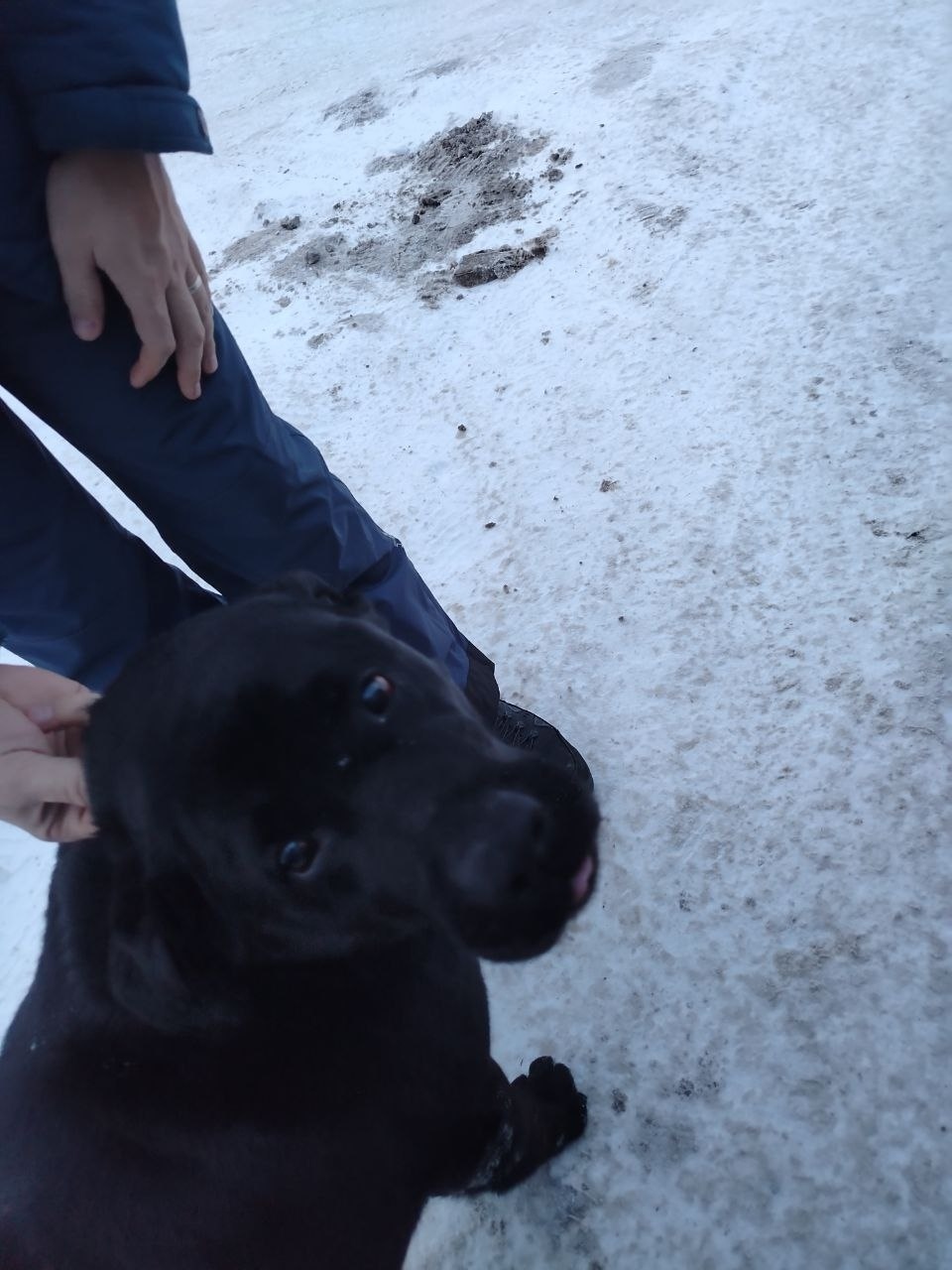Возможно лабрадор ретривер, чёрного окраса. Очень дружелюбный, стоило открыть дверь, сразу забрался в машину. Видно, что домашний. В ошейнике с карабином. Ощущение, что был пристегнут на цепь или поводок и разогнул карабин. Бегал в посёлке Рудаково, по улице Л. Толстого.