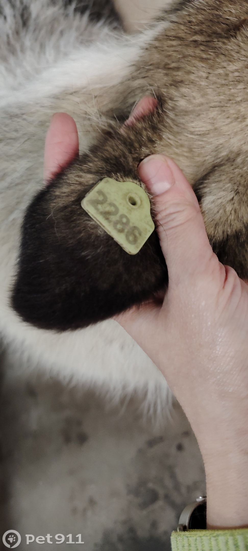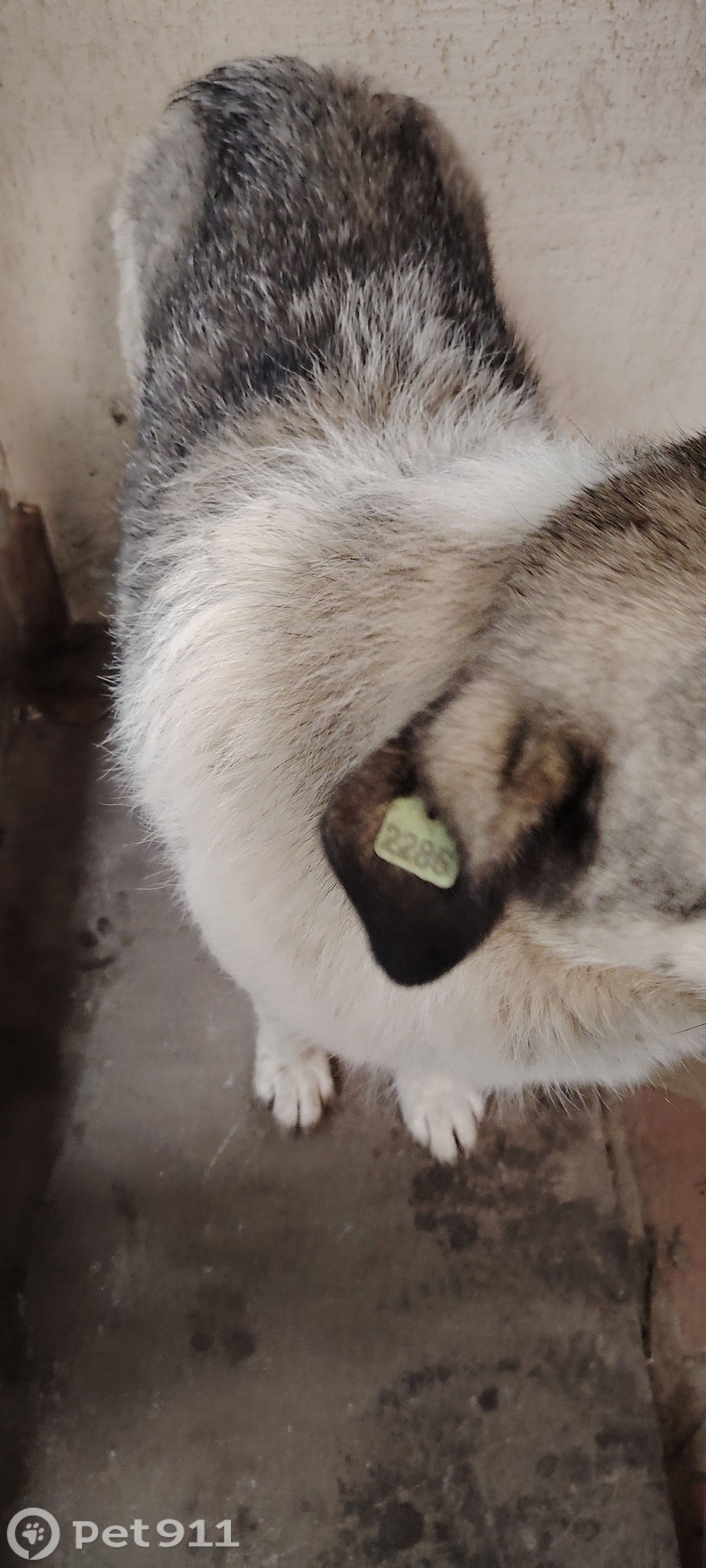 Белый с серыми пятнами, на задних лапах есть пятый палец. Очень ласковый. 7.12 видели его г. Донской на Бобрик горе. Просьба если есть возможность попредержать его будем благодарны. Бирка на ухе с номером 2286. Номер для связи Людмила.