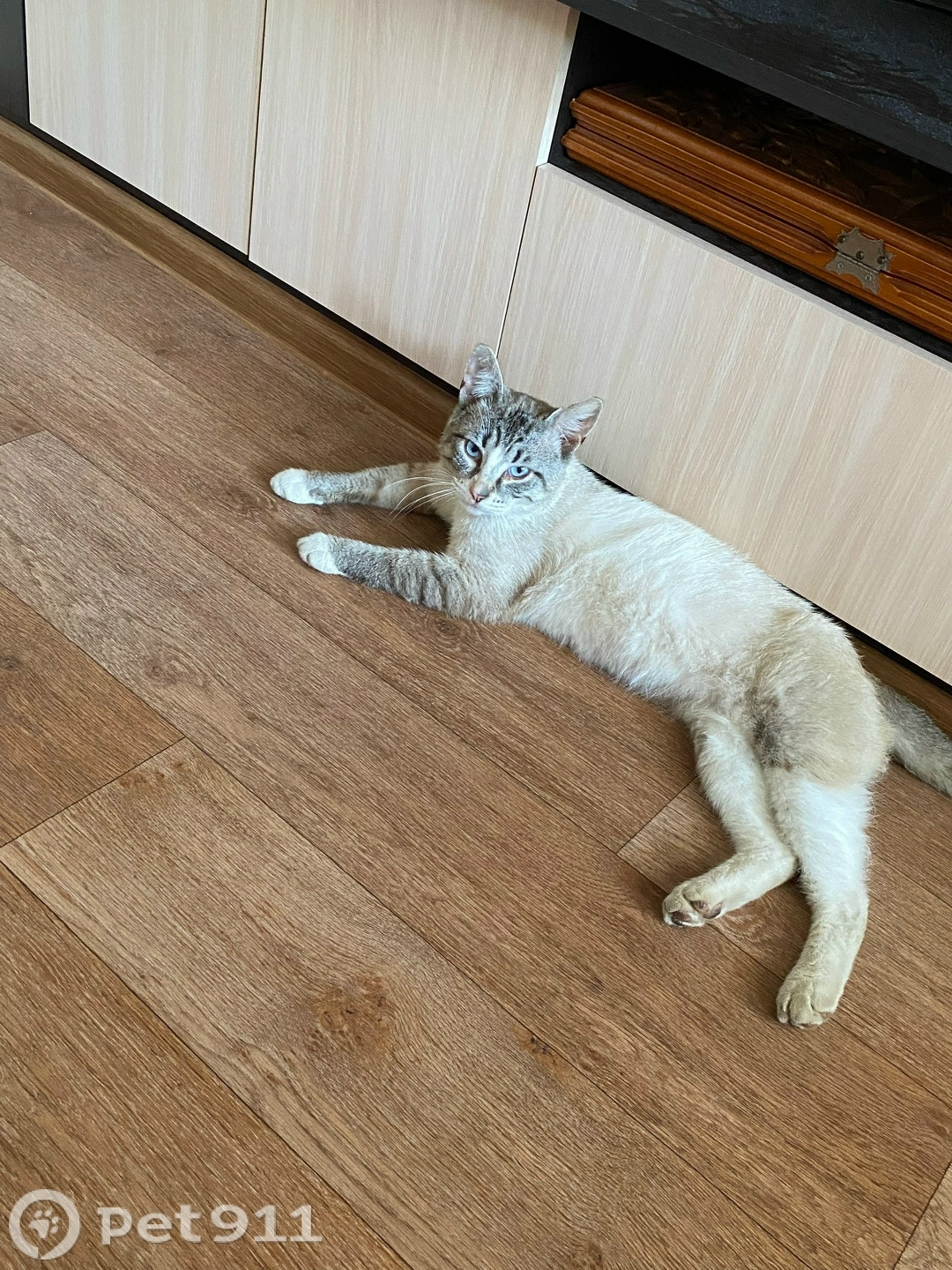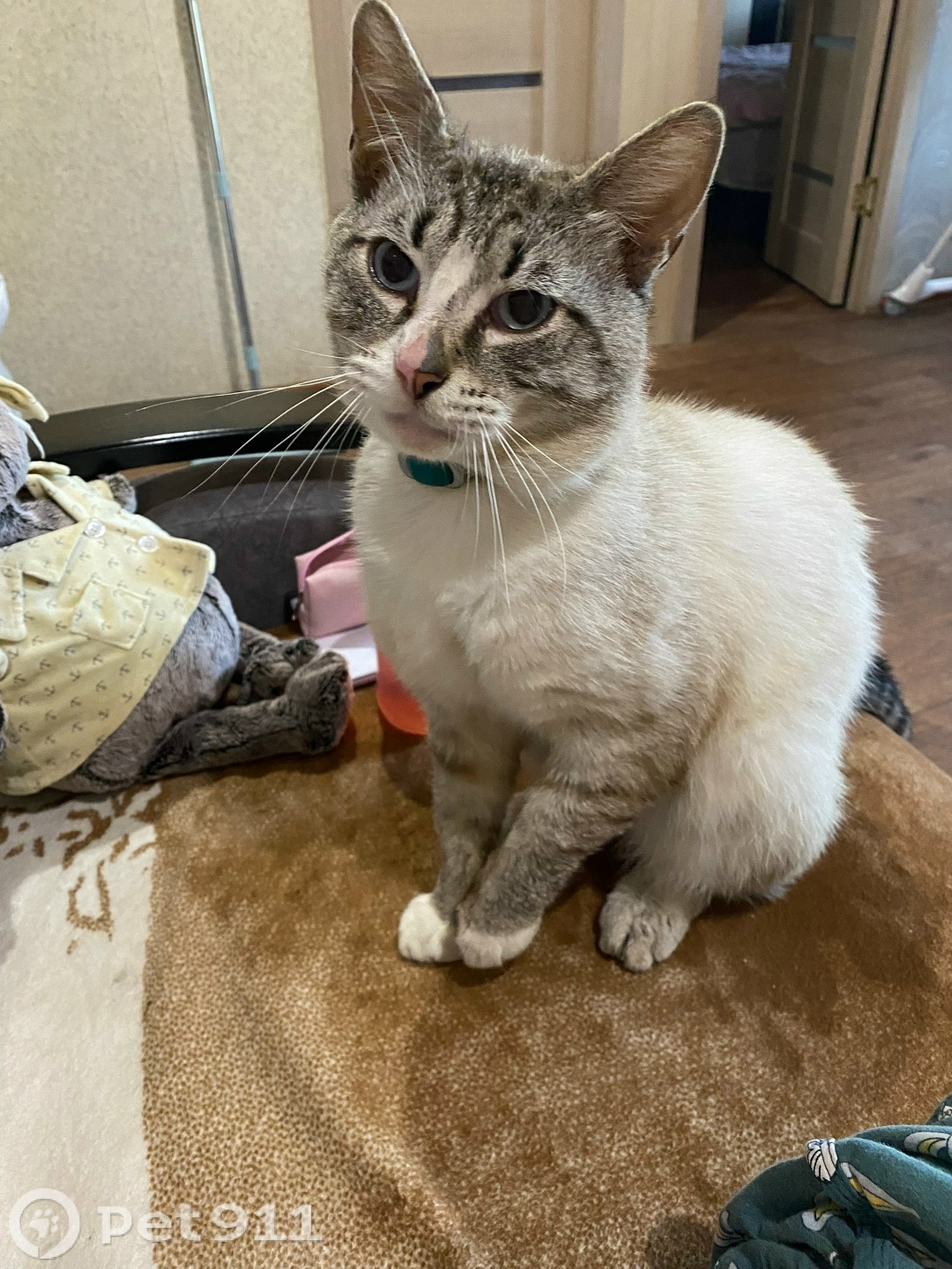 На нем зеленый ошейник. Кот добрый и не агрессивный. На свое имя откликается