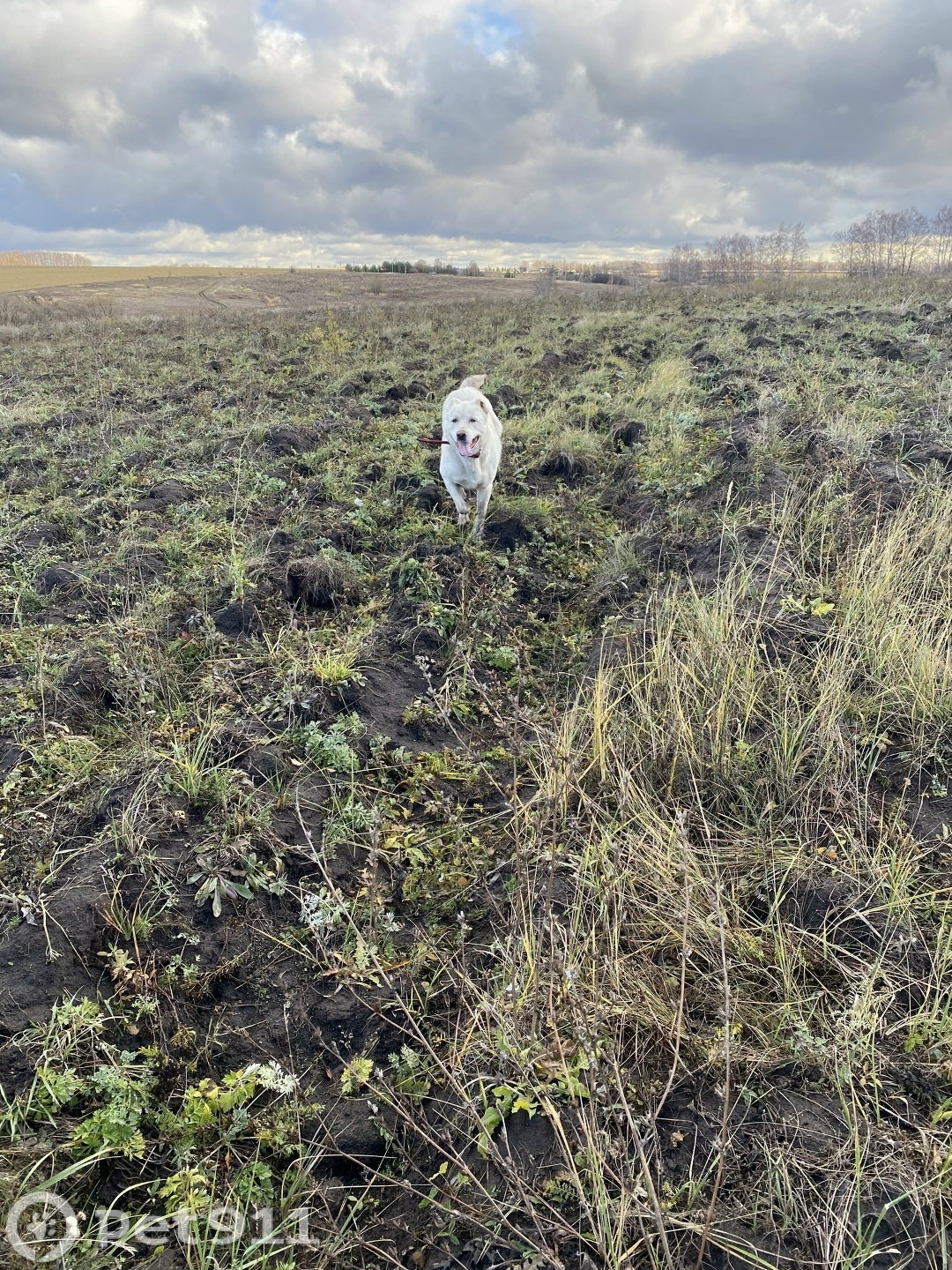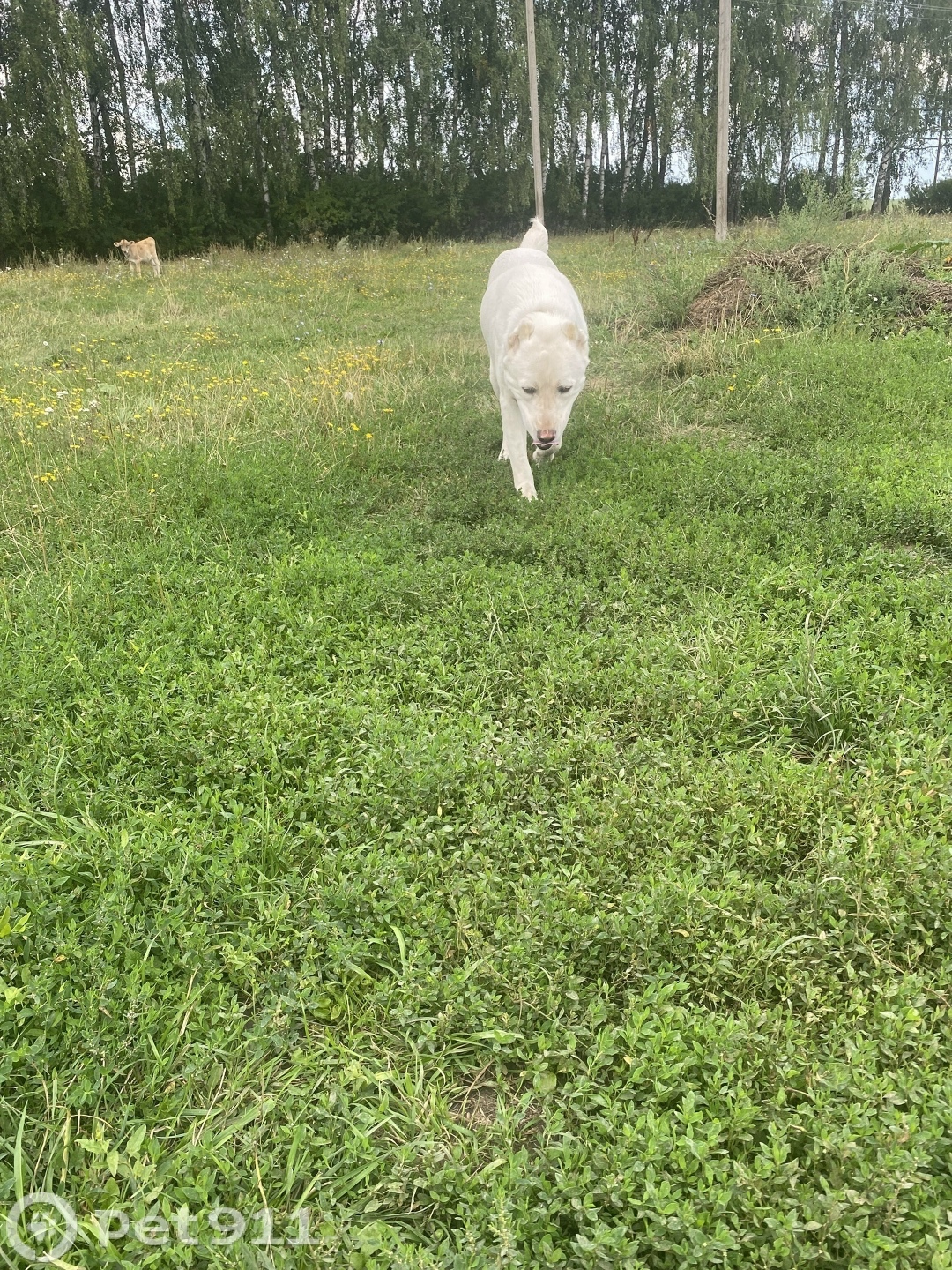 Белый, похож на медведя, купированный, крупный, нос розово - черный, 3 года, убежал без ошейника