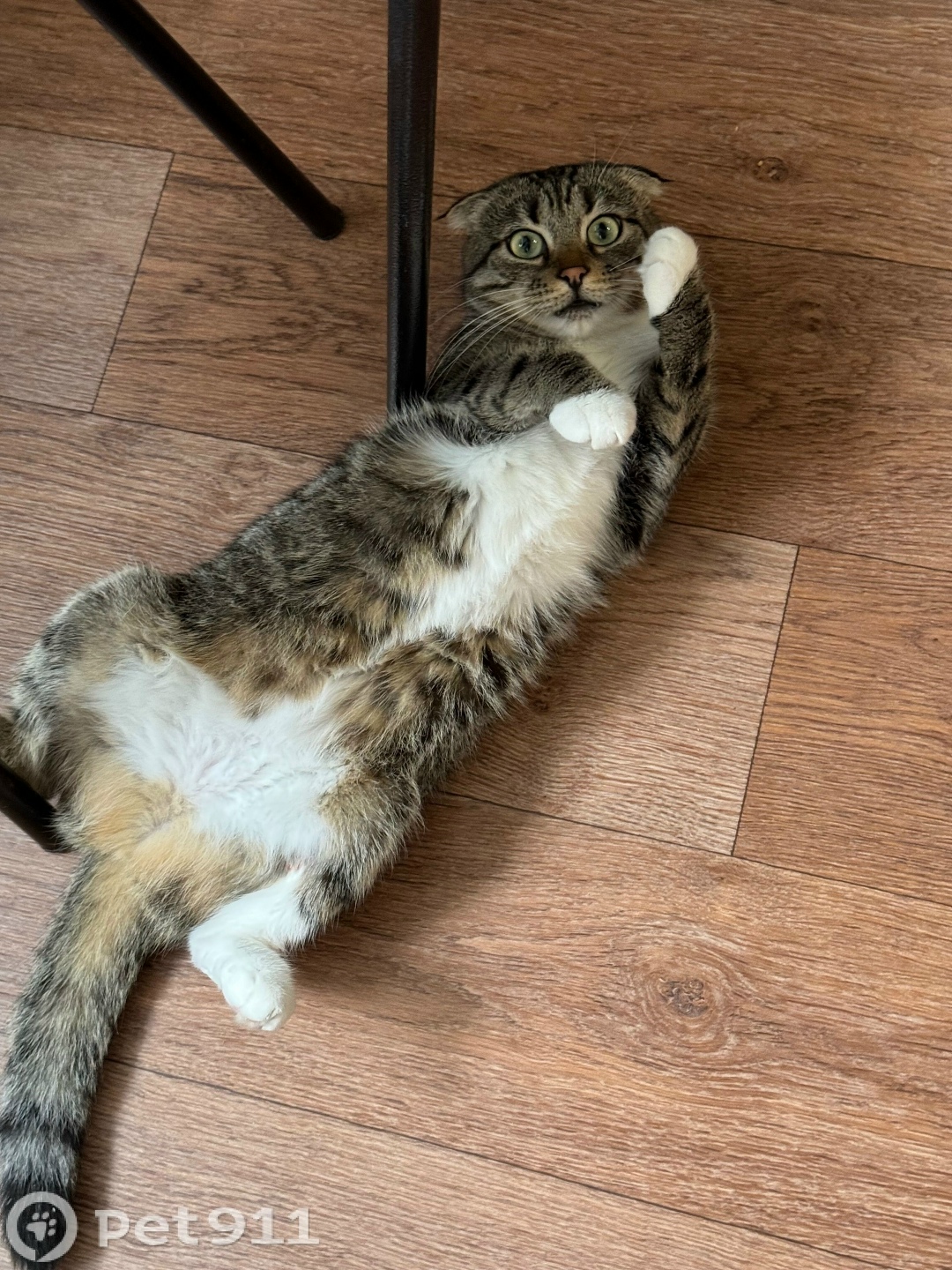 Молодая кошка , полосатой расцветки , вислоухие уши , кличка Алиса . Вероятнее всего выбежала из квартиры , судя по камерам домофона , соседи выпустили ее в 12:45 часов из подъезда .