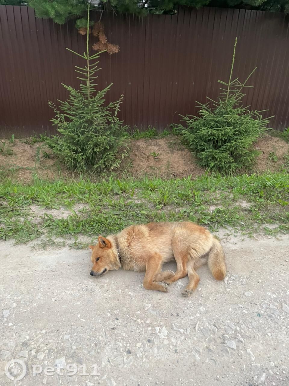 Кобель, примерно 40 см в холке, рыжий, черный подвод глаз, пушистый хвост, есть ошейник, знает стандартные команды
