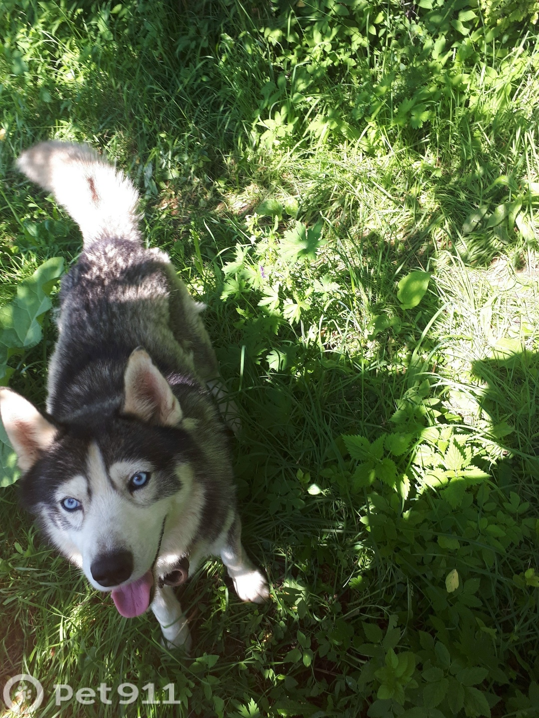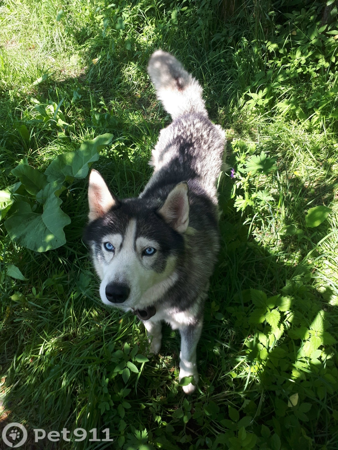 Окрас хаски, голубые глаза, дружелюбная, с ошейником